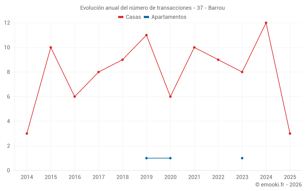 El precio mediano en las 19 transacciones de casas de los últimos 24 meses en la comuna de Barrou fue de 818 € por metro cuadrado para un valor patrimonial medio de 105 000 €. Durante este período el 60% de las transacciones estuvieron entre 632 y 1 529 € por metro cuadrado (del 2º al 8º decil).