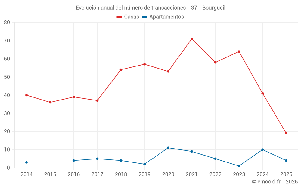El precio mediano en las 15 transacciones de apartamentos de los últimos 24 meses en la comuna de Bourgueil fue de 1 250 € por metro cuadrado para un valor patrimonial medio de 60 000 €. Durante este período el 60% de las transacciones estuvieron entre 1 079 y 1 568 € por metro cuadrado (del 2º al 8º decil).
