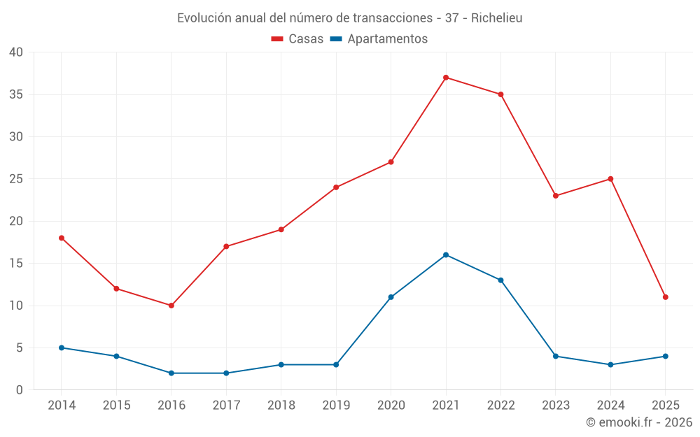El precio mediano en las 20 transacciones de casas de los últimos 12 meses en la comuna de Richelieu fue de 1 216 € por metro cuadrado para un valor patrimonial medio de 106 700 €. Durante este período el 60% de las transacciones estuvieron entre 678 y 1 658 € por metro cuadrado (del 2º al 8º decil).