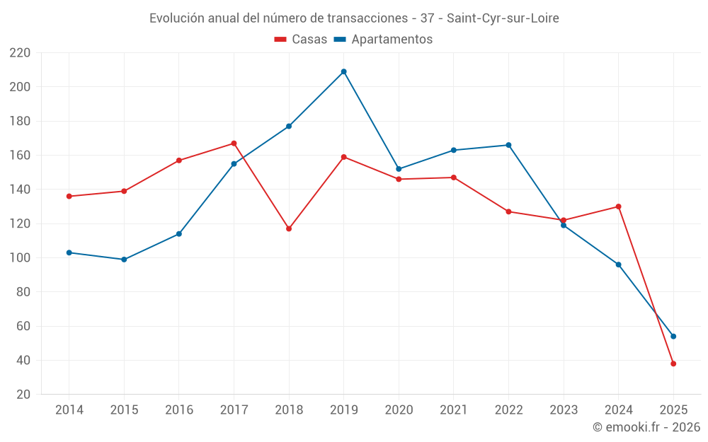 El precio mediano en las 38 transacciones de casas de los últimos 6 meses en la comuna de Saint-Cyr-sur-Loire fue de 3 429 € por metro cuadrado para un valor patrimonial medio de 282 800 €. Durante este período el 60% de las transacciones estuvieron entre 2 704 y 4 437 € por metro cuadrado (del 2º al 8º decil).