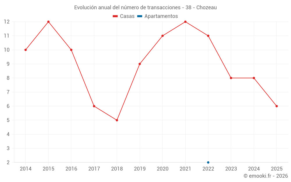 El precio mediano en las 20 transacciones de casas de los últimos 24 meses en la comuna de Chozeau fue de 2 864 € por metro cuadrado para un valor patrimonial medio de 305 500 €. Durante este período el 60% de las transacciones estuvieron entre 1 806 y 3 638 € por metro cuadrado (del 2º al 8º decil).