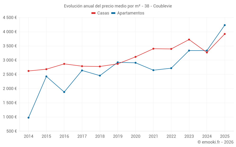 El precio mediano en las 18 transacciones de apartamentos de los últimos 24 meses en la comuna de Coublevie fue de 3 490 € por metro cuadrado para un valor patrimonial medio de 250 465 €. Durante este período el 60% de las transacciones estuvieron entre 3 004 y 4 036 € por metro cuadrado (del 2º al 8º decil).
