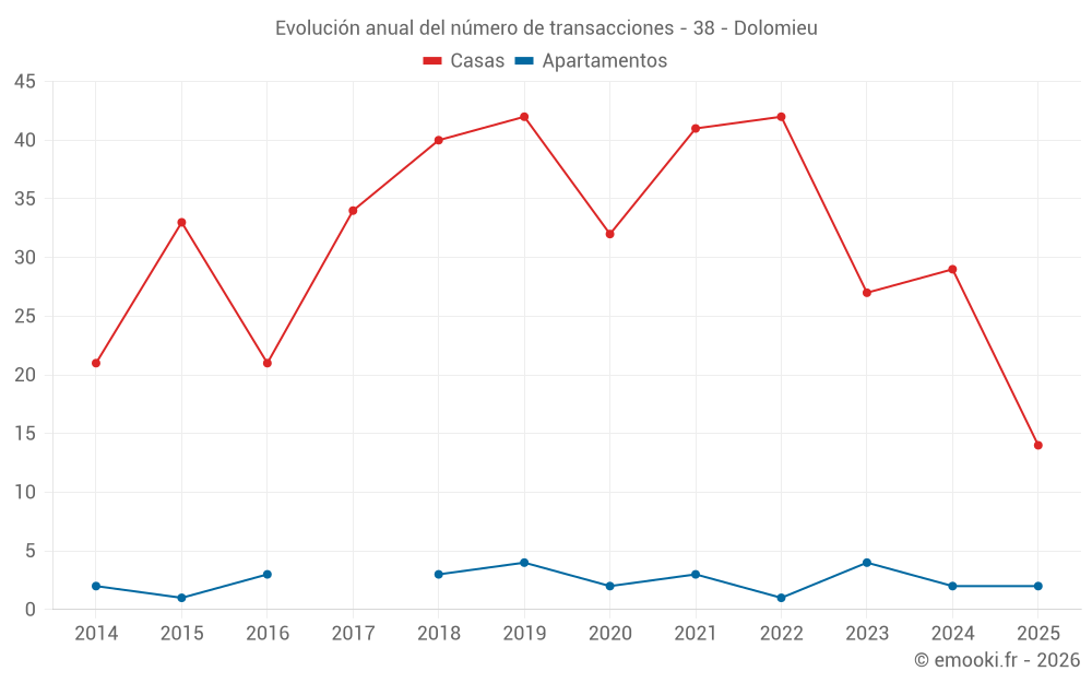 El precio mediano en las 31 transacciones de casas de los últimos 12 meses en la comuna de Dolomieu fue de 2 167 € por metro cuadrado para un valor patrimonial medio de 236 000 €. Durante este período el 60% de las transacciones estuvieron entre 1 410 y 2 731 € por metro cuadrado (del 2º al 8º decil).