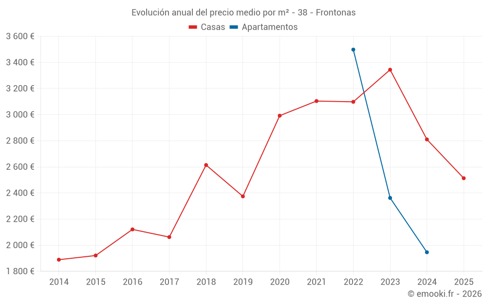 El precio mediano en las 34 transacciones de casas de los últimos 24 meses en la comuna de Frontonas fue de 2 938 € por metro cuadrado para un valor patrimonial medio de 314 655 €. Durante este período el 60% de las transacciones estuvieron entre 2 141 y 3 547 € por metro cuadrado (del 2º al 8º decil).