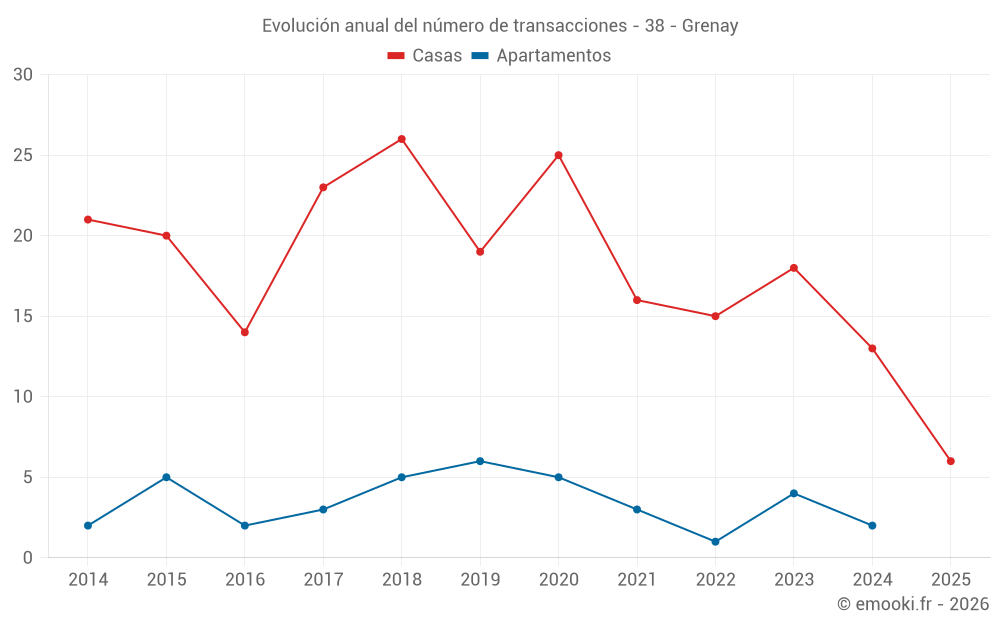 El precio mediano en las 28 transacciones de casas de los últimos 24 meses en la comuna de Grenay fue de 3 301 € por metro cuadrado para un valor patrimonial medio de 317 150 €. Durante este período el 60% de las transacciones estuvieron entre 2 103 y 3 800 € por metro cuadrado (del 2º al 8º decil).