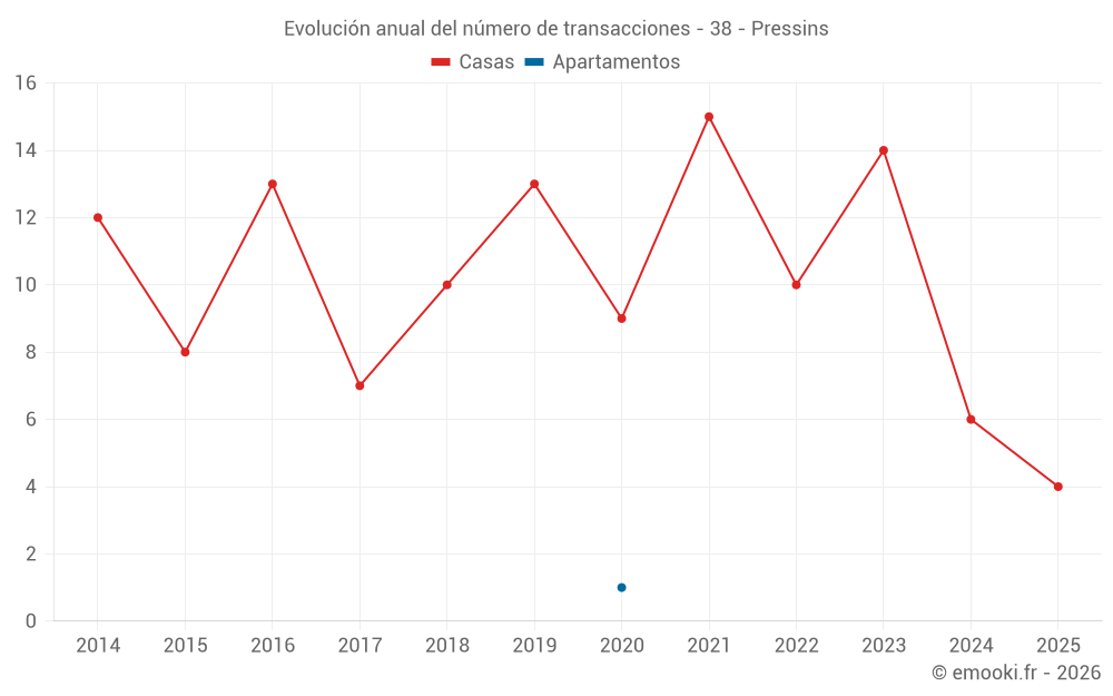El precio mediano en las 18 transacciones de casas de los últimos 24 meses en la comuna de Pressins fue de 2 601 € por metro cuadrado para un valor patrimonial medio de 280 818 €. Durante este período el 60% de las transacciones estuvieron entre 1 857 y 3 170 € por metro cuadrado (del 2º al 8º decil).