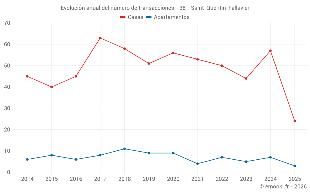 El precio mediano en las 24 transacciones de casas de los últimos 6 meses en la comuna de Saint-Quentin-Fallavier fue de 2 653 € por metro cuadrado para un valor patrimonial medio de 262 175 €. Durante este período el 60% de las transacciones estuvieron entre 2 221 y 3 191 € por metro cuadrado (del 2º al 8º decil).