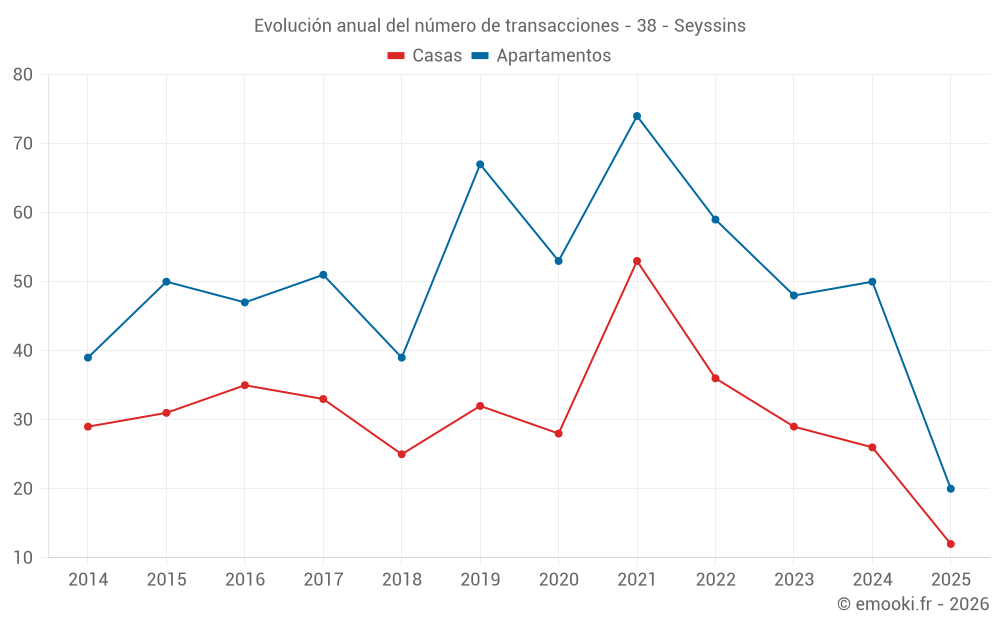 El precio mediano en las 27 transacciones de casas de los últimos 12 meses en la comuna de Seyssins fue de 4 250 € por metro cuadrado para un valor patrimonial medio de 465 900 €. Durante este período el 60% de las transacciones estuvieron entre 3 329 y 4 856 € por metro cuadrado (del 2º al 8º decil).