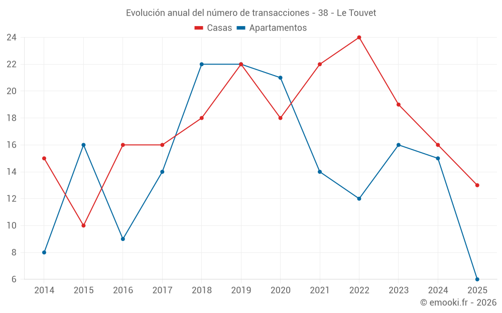 El precio mediano en las 24 transacciones de casas de los últimos 12 meses en la comuna de Le Touvet fue de 3 344 € por metro cuadrado para un valor patrimonial medio de 325 895 €. Durante este período el 60% de las transacciones estuvieron entre 2 544 y 3 765 € por metro cuadrado (del 2º al 8º decil).