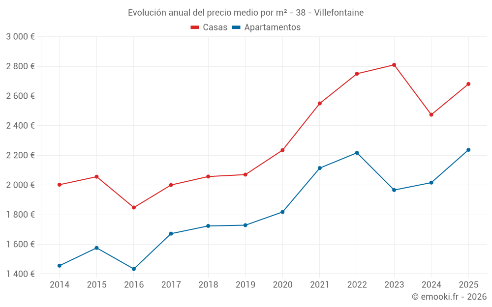 El precio mediano en las 20 transacciones de casas de los últimos 3 meses en la comuna de Villefontaine fue de 2 727 € por metro cuadrado para un valor patrimonial medio de 241 245 €. Durante este período el 60% de las transacciones estuvieron entre 1 877 y 3 447 € por metro cuadrado (del 2º al 8º decil).