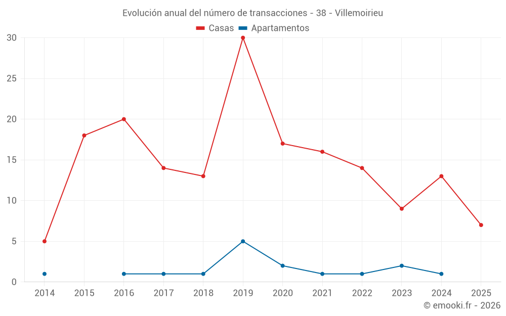 El precio mediano en las 27 transacciones de casas de los últimos 24 meses en la comuna de Villemoirieu fue de 3 012 € por metro cuadrado para un valor patrimonial medio de 295 200 €. Durante este período el 60% de las transacciones estuvieron entre 2 218 y 3 812 € por metro cuadrado (del 2º al 8º decil).