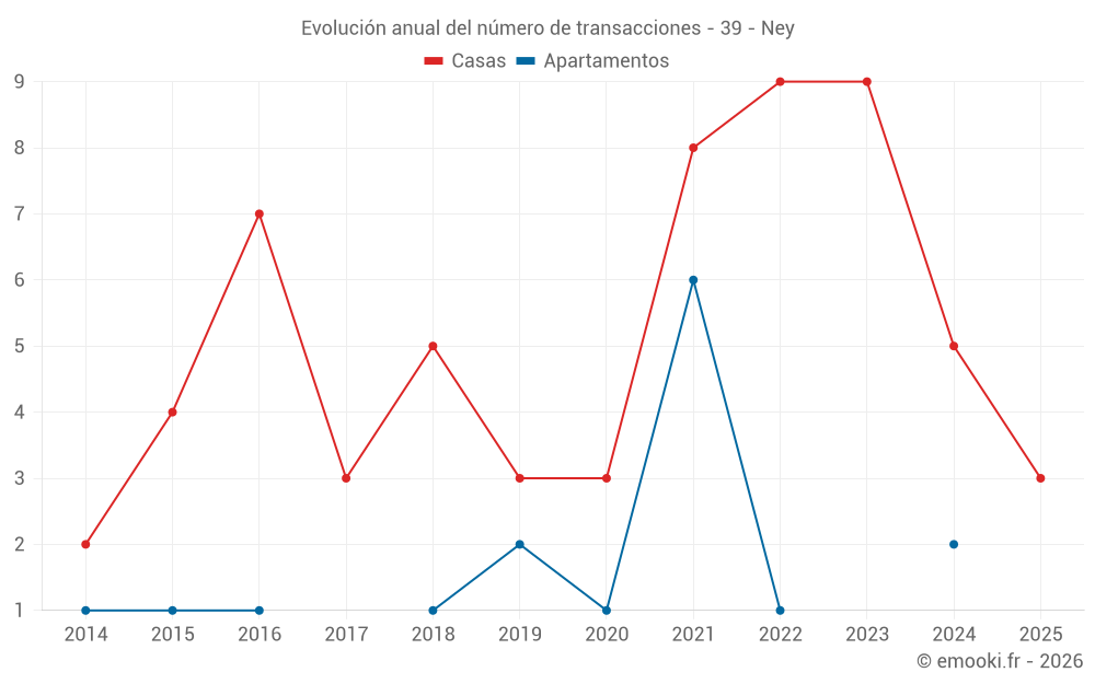El precio mediano en las 15 transacciones de casas de los últimos 24 meses en la comuna de Ney fue de 1 777 € por metro cuadrado para un valor patrimonial medio de 210 000 €. Durante este período el 60% de las transacciones estuvieron entre 942 y 2 162 € por metro cuadrado (del 2º al 8º decil).