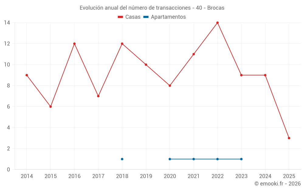 El precio mediano en las 17 transacciones de casas de los últimos 24 meses en la comuna de Brocas fue de 1 613 € por metro cuadrado para un valor patrimonial medio de 162 650 €. Durante este período el 60% de las transacciones estuvieron entre 937 y 2 123 € por metro cuadrado (del 2º al 8º decil).