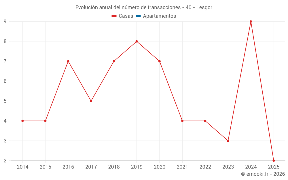 El precio mediano en las 14 transacciones de casas de los últimos 24 meses en la comuna de Lesgor fue de 1 718 € por metro cuadrado para un valor patrimonial medio de 189 000 €. Durante este período el 60% de las transacciones estuvieron entre 1 378 y 2 162 € por metro cuadrado (del 2º al 8º decil).