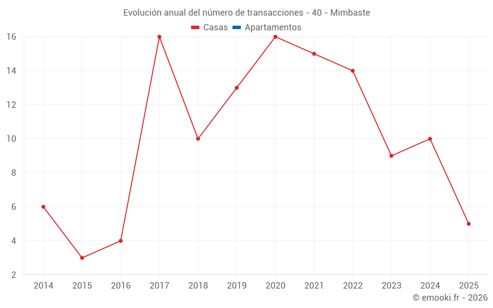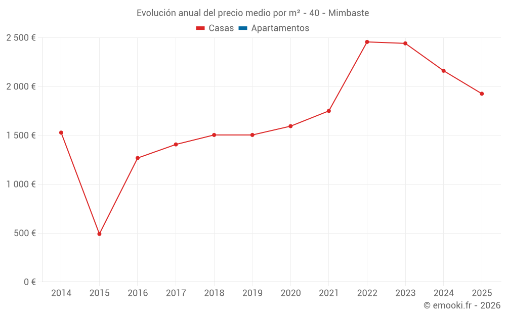 El precio mediano en las 19 transacciones de casas de los últimos 24 meses en la comuna de Mimbaste fue de 2 014 € por metro cuadrado para un valor patrimonial medio de 270 000 €. Durante este período el 60% de las transacciones estuvieron entre 946 y 2 530 € por metro cuadrado (del 2º al 8º decil).