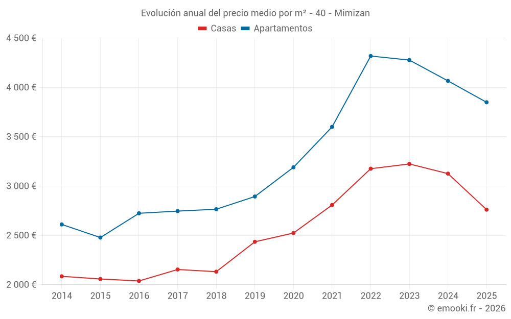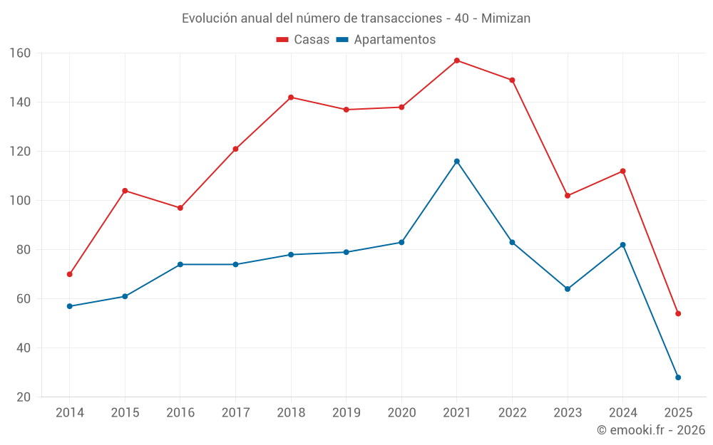 El precio mediano en las 28 transacciones de apartamentos de los últimos 6 meses en la comuna de Mimizan fue de 3 849 € por metro cuadrado para un valor patrimonial medio de 175 860 €. Durante este período el 60% de las transacciones estuvieron entre 3 265 y 4 603 € por metro cuadrado (del 2º al 8º decil).