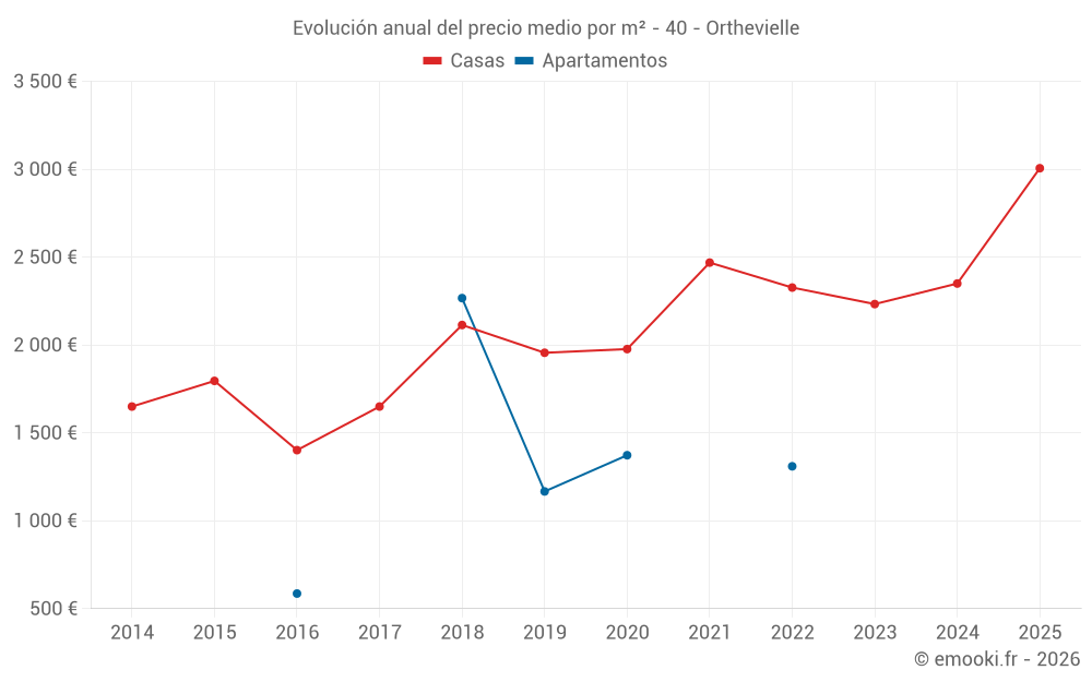 El precio mediano en las 22 transacciones de casas de los últimos 24 meses en la comuna de Orthevielle fue de 2 386 € por metro cuadrado para un valor patrimonial medio de 231 000 €. Durante este período el 60% de las transacciones estuvieron entre 1 320 y 3 189 € por metro cuadrado (del 2º al 8º decil).