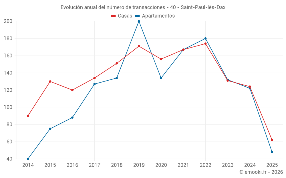 El precio mediano en las 22 transacciones de apartamentos de los últimos 3 meses en la comuna de Saint-Paul-lès-Dax fue de 2 572 € por metro cuadrado para un valor patrimonial medio de 132 400 €. Durante este período el 60% de las transacciones estuvieron entre 2 332 y 3 059 € por metro cuadrado (del 2º al 8º decil).