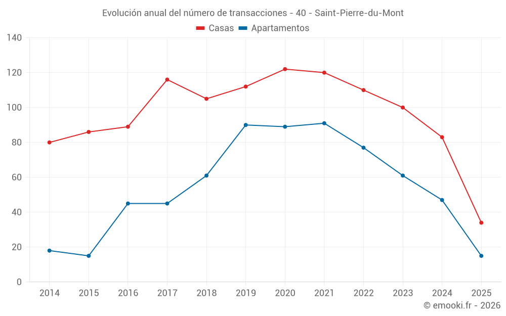El precio mediano en las 34 transacciones de casas de los últimos 6 meses en la comuna de Saint-Pierre-du-Mont fue de 2 103 € por metro cuadrado para un valor patrimonial medio de 188 000 €. Durante este período el 60% de las transacciones estuvieron entre 1 467 y 2 420 € por metro cuadrado (del 2º al 8º decil).