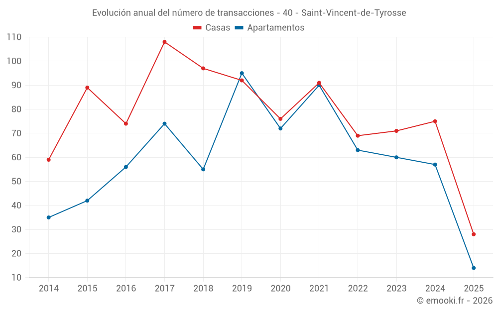El precio mediano en las 28 transacciones de casas de los últimos 6 meses en la comuna de Saint-Vincent-de-Tyrosse fue de 3 222 € por metro cuadrado para un valor patrimonial medio de 312 600 €. Durante este período el 60% de las transacciones estuvieron entre 2 444 y 3 928 € por metro cuadrado (del 2º al 8º decil).