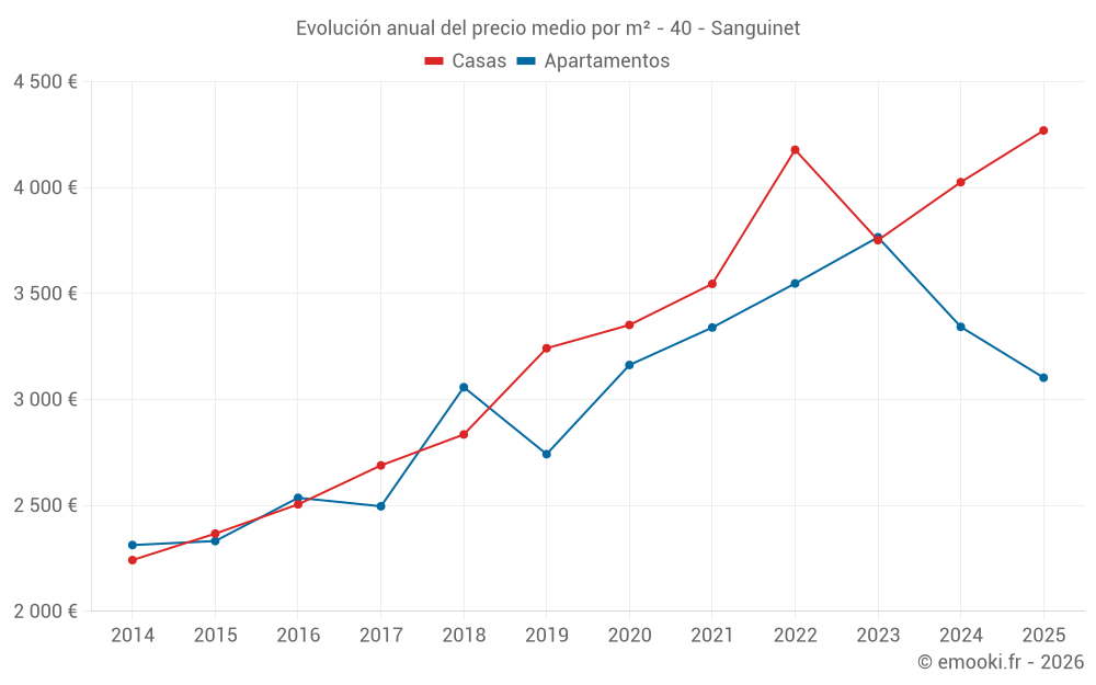 El precio mediano en las 17 transacciones de apartamentos de los últimos 24 meses en la comuna de Sanguinet fue de 3 415 € por metro cuadrado para un valor patrimonial medio de 245 700 €. Durante este período el 60% de las transacciones estuvieron entre 3 167 y 3 766 € por metro cuadrado (del 2º al 8º decil).