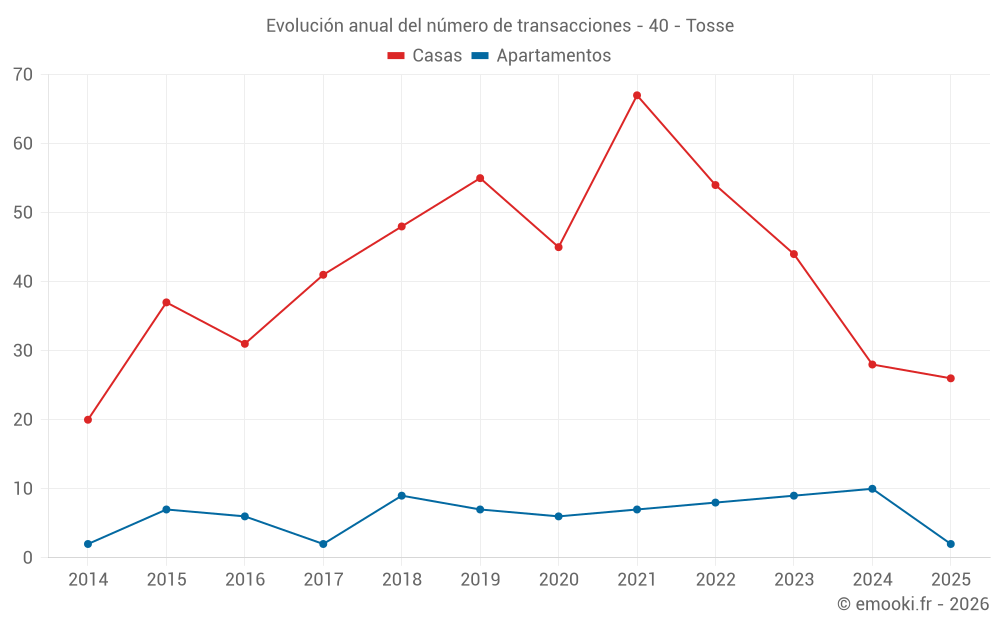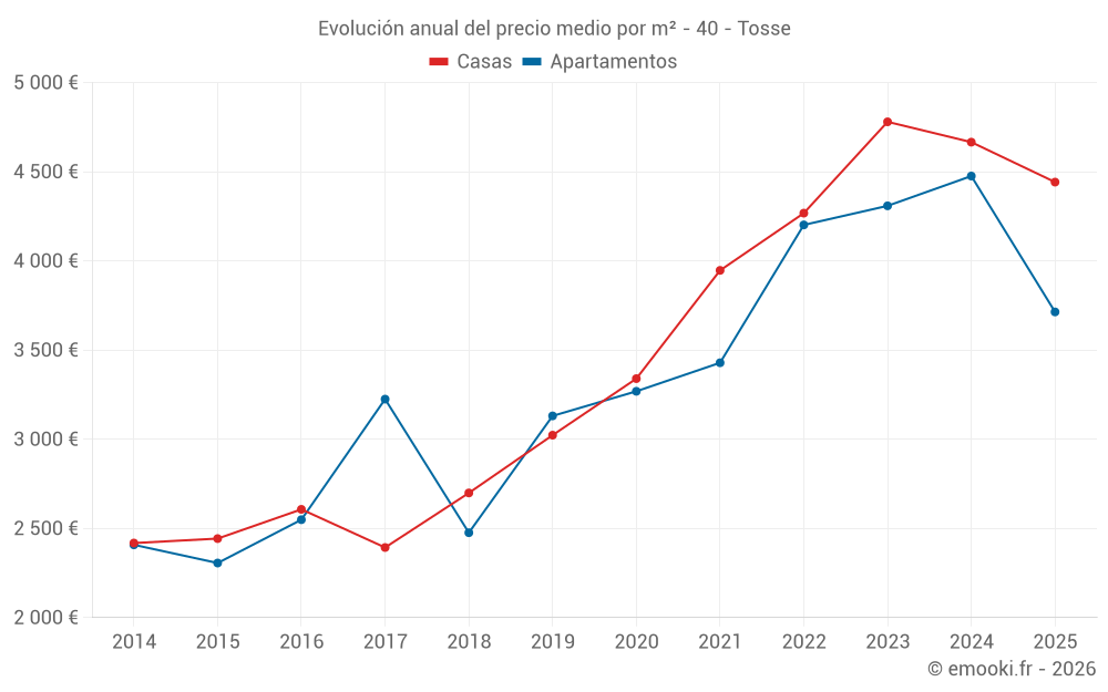El precio mediano en las 26 transacciones de casas de los últimos 6 meses en la comuna de Tosse fue de 4 442 € por metro cuadrado para un valor patrimonial medio de 415 400 €. Durante este período el 60% de las transacciones estuvieron entre 3 603 y 5 354 € por metro cuadrado (del 2º al 8º decil).