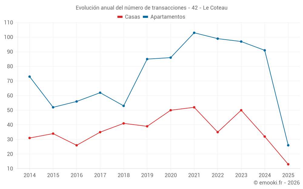 El precio mediano en las 26 transacciones de apartamentos de los últimos 6 meses en la comuna de Le Coteau fue de 1 144 € por metro cuadrado para un valor patrimonial medio de 77 000 €. Durante este período el 60% de las transacciones estuvieron entre 933 y 1 609 € por metro cuadrado (del 2º al 8º decil).