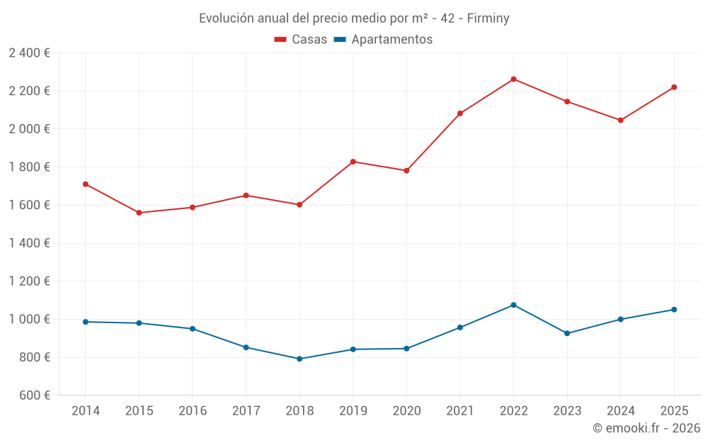 El precio mediano en las 41 transacciones de apartamentos de los últimos 6 meses en la comuna de Firminy fue de 1 051 € por metro cuadrado para un valor patrimonial medio de 75 000 €. Durante este período el 60% de las transacciones estuvieron entre 748 y 1 284 € por metro cuadrado (del 2º al 8º decil).