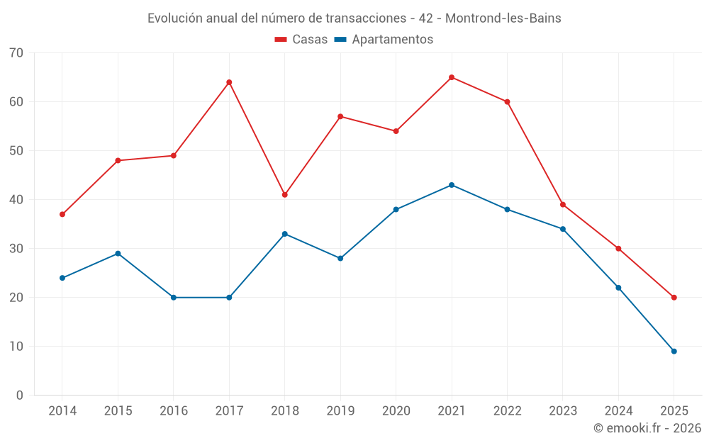 El precio mediano en las 21 transacciones de apartamentos de los últimos 12 meses en la comuna de Montrond-les-Bains fue de 2 038 € por metro cuadrado para un valor patrimonial medio de 128 817 €. Durante este período el 60% de las transacciones estuvieron entre 1 689 y 2 419 € por metro cuadrado (del 2º al 8º decil).