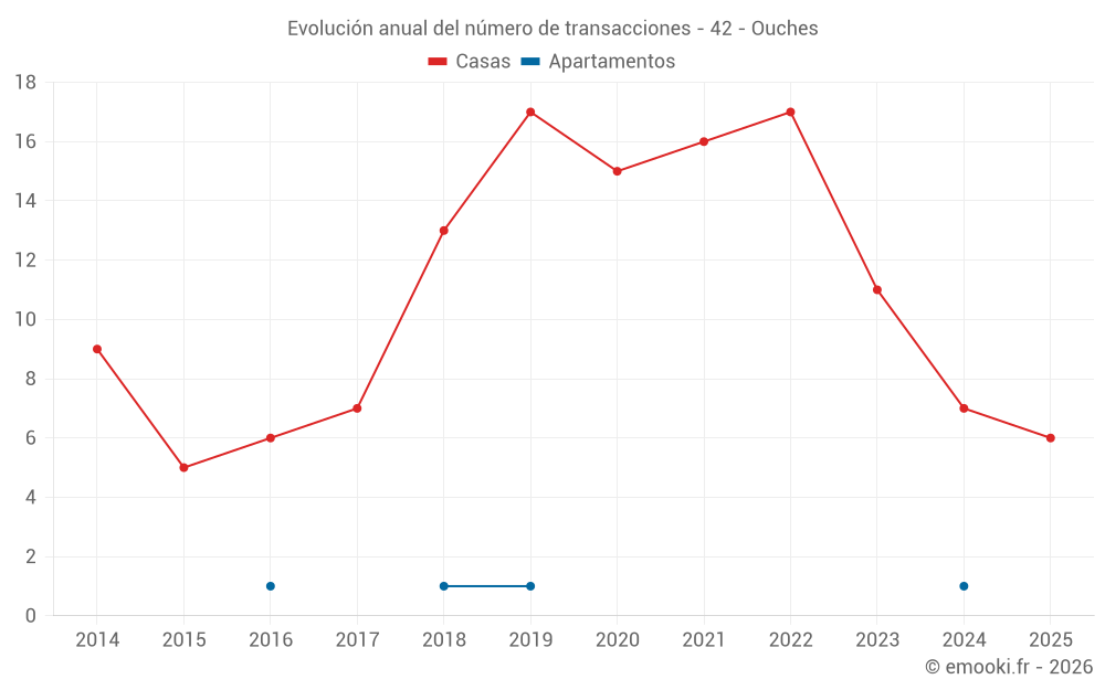 El precio mediano en las 20 transacciones de casas de los últimos 24 meses en la comuna de Ouches fue de 1 852 € por metro cuadrado para un valor patrimonial medio de 203 500 €. Durante este período el 60% de las transacciones estuvieron entre 1 499 y 2 283 € por metro cuadrado (del 2º al 8º decil).