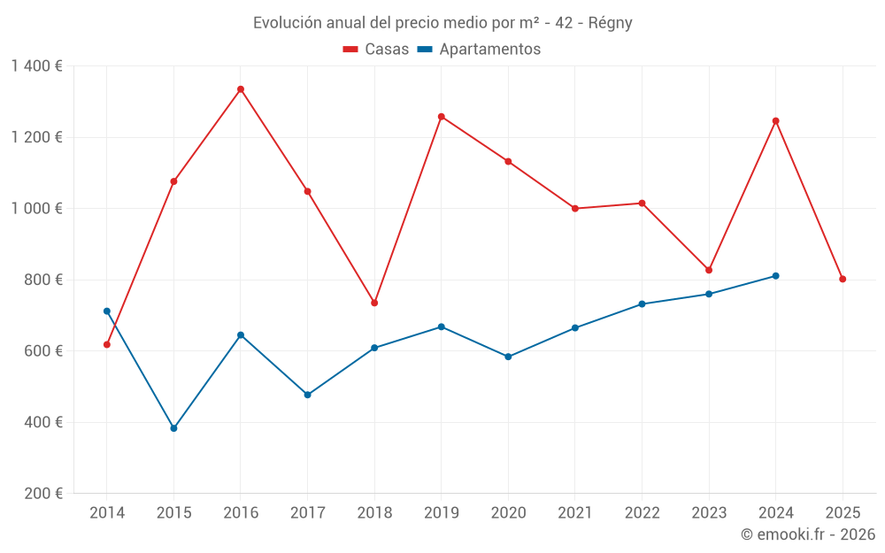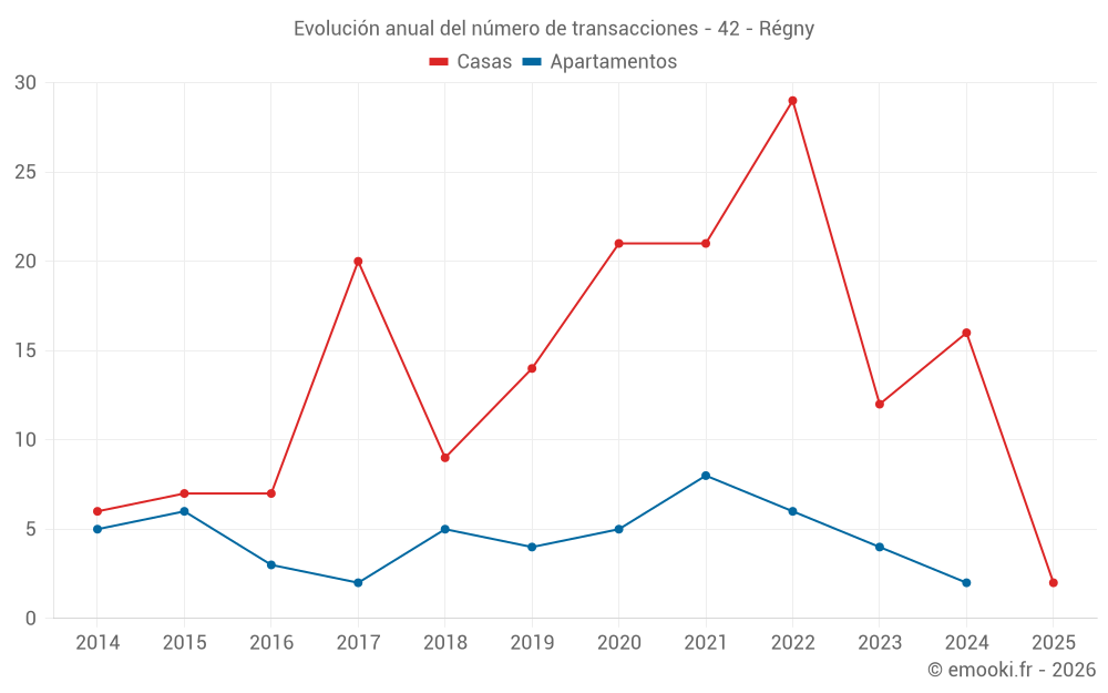 El precio mediano en las 23 transacciones de casas de los últimos 24 meses en la comuna de Régny fue de 1 221 € por metro cuadrado para un valor patrimonial medio de 80 000 €. Durante este período el 60% de las transacciones estuvieron entre 545 y 1 486 € por metro cuadrado (del 2º al 8º decil).