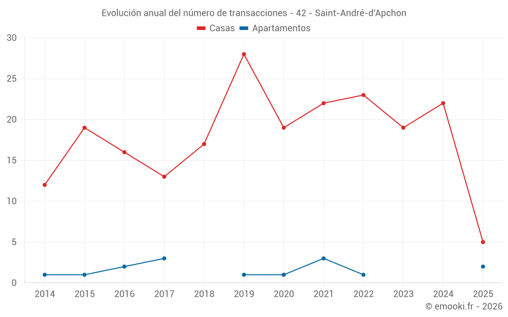 El precio mediano en las 17 transacciones de casas de los últimos 12 meses en la comuna de Saint-André-d'Apchon fue de 1 675 € por metro cuadrado para un valor patrimonial medio de 168 400 €. Durante este período el 60% de las transacciones estuvieron entre 1 280 y 2 216 € por metro cuadrado (del 2º al 8º decil).