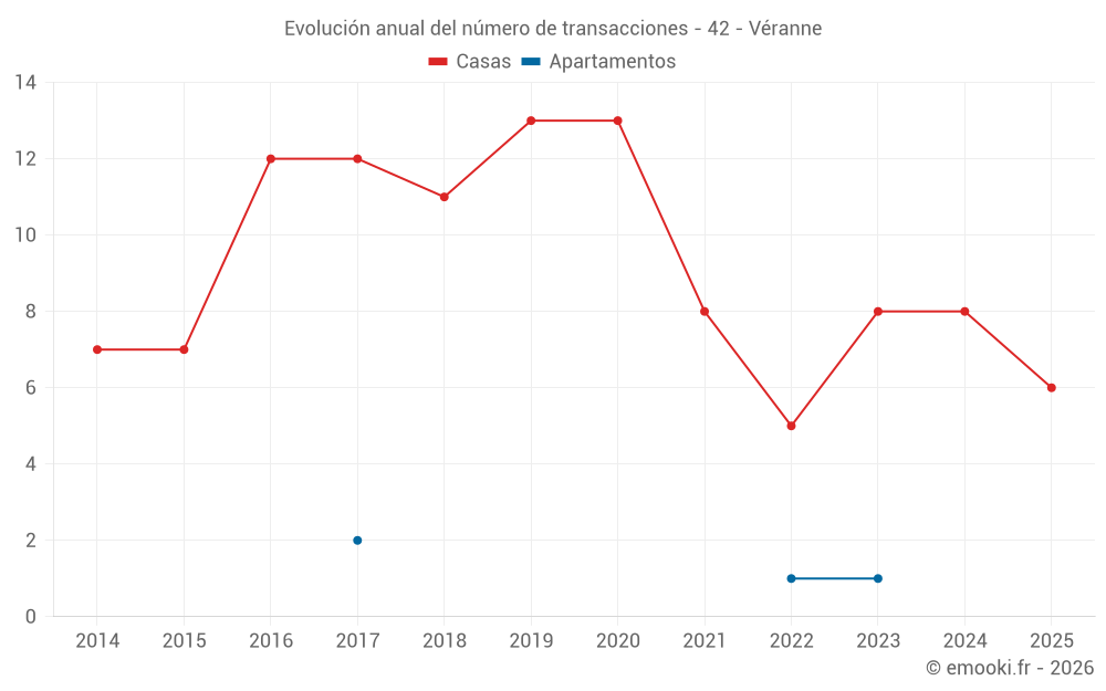 El precio mediano en las 20 transacciones de casas de los últimos 24 meses en la comuna de Véranne fue de 2 404 € por metro cuadrado para un valor patrimonial medio de 303 725 €. Durante este período el 60% de las transacciones estuvieron entre 1 253 y 2 951 € por metro cuadrado (del 2º al 8º decil).