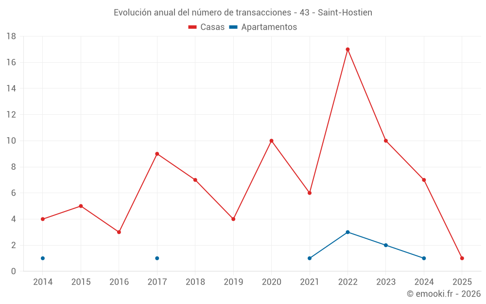 El precio mediano en las 15 transacciones de casas de los últimos 24 meses en la comuna de Saint-Hostien fue de 2 000 € por metro cuadrado para un valor patrimonial medio de 183 900 €. Durante este período el 60% de las transacciones estuvieron entre 1 208 y 2 384 € por metro cuadrado (del 2º al 8º decil).