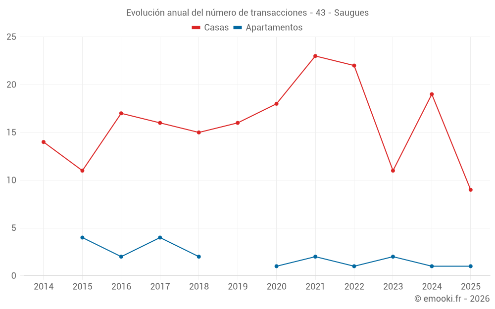 El precio mediano en las 18 transacciones de casas de los últimos 12 meses en la comuna de Saugues fue de 784 € por metro cuadrado para un valor patrimonial medio de 64 688 €. Durante este período el 60% de las transacciones estuvieron entre 218 y 1 776 € por metro cuadrado (del 2º al 8º decil).