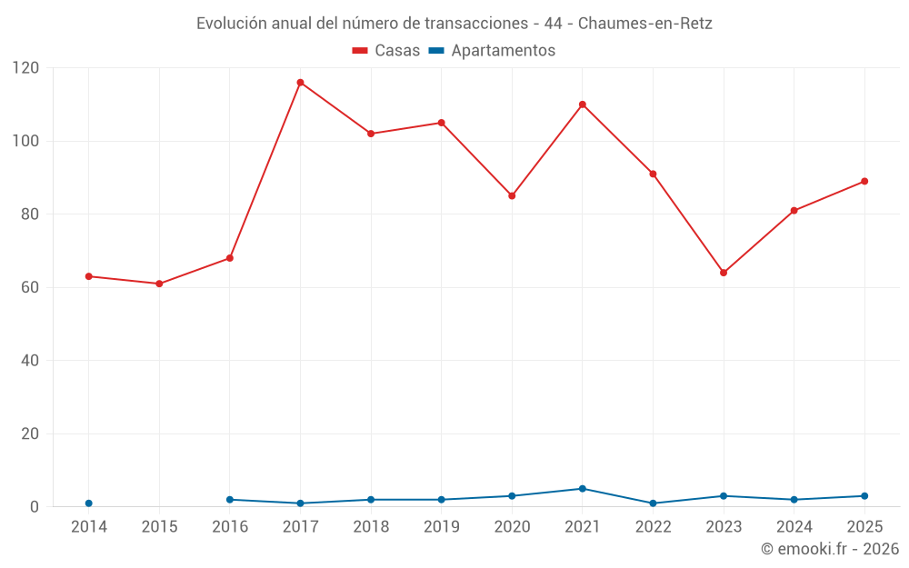 El precio mediano en las 28 transacciones de casas de los últimos 3 meses en la comuna de Chaumes-en-Retz fue de 2 610 € por metro cuadrado para un valor patrimonial medio de 232 500 €. Durante este período el 60% de las transacciones estuvieron entre 1 700 y 2 985 € por metro cuadrado (del 2º al 8º decil).