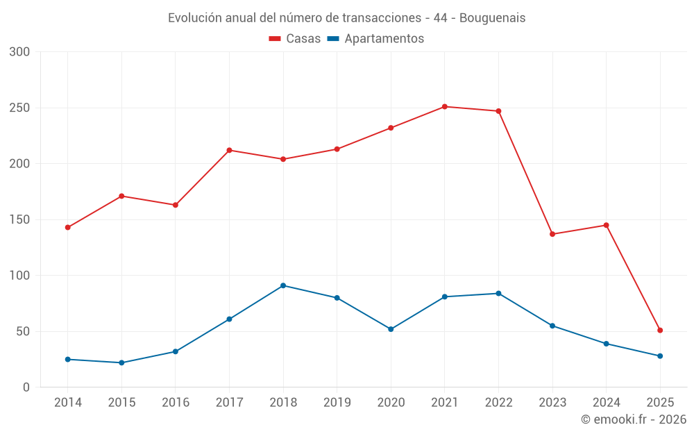 El precio mediano en las 51 transacciones de casas de los últimos 6 meses en la comuna de Bouguenais fue de 2 869 € por metro cuadrado para un valor patrimonial medio de 250 000 €. Durante este período el 60% de las transacciones estuvieron entre 2 226 y 3 402 € por metro cuadrado (del 2º al 8º decil).