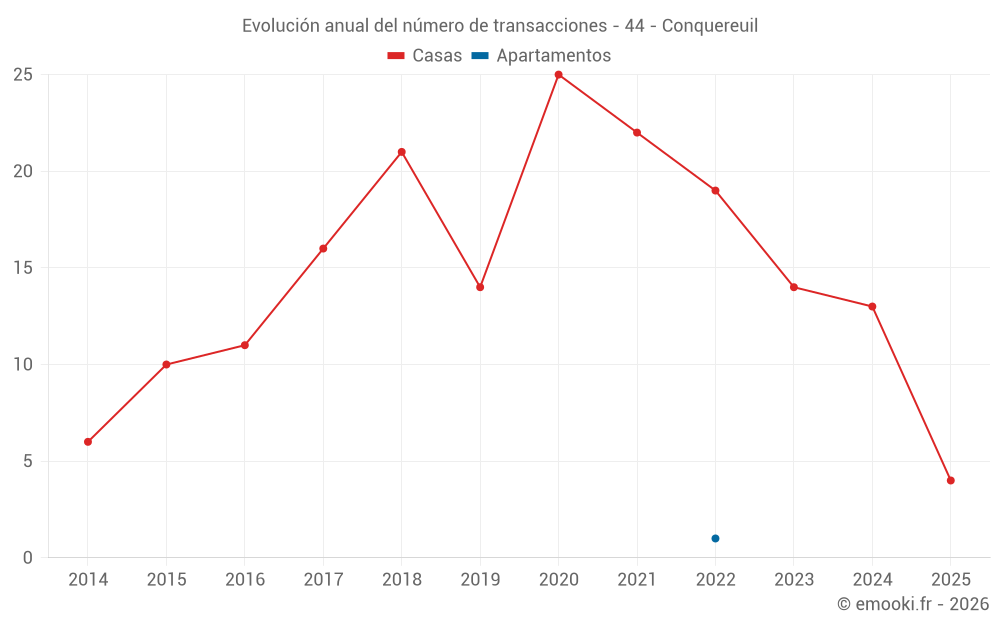 El precio mediano en las 22 transacciones de casas de los últimos 24 meses en la comuna de Conquereuil fue de 1 353 € por metro cuadrado para un valor patrimonial medio de 142 500 €. Durante este período el 60% de las transacciones estuvieron entre 743 y 1 710 € por metro cuadrado (del 2º al 8º decil).