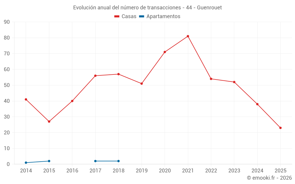 El precio mediano en las 23 transacciones de casas de los últimos 6 meses en la comuna de Guenrouet fue de 1 852 € por metro cuadrado para un valor patrimonial medio de 151 000 €. Durante este período el 60% de las transacciones estuvieron entre 1 272 y 2 405 € por metro cuadrado (del 2º al 8º decil).