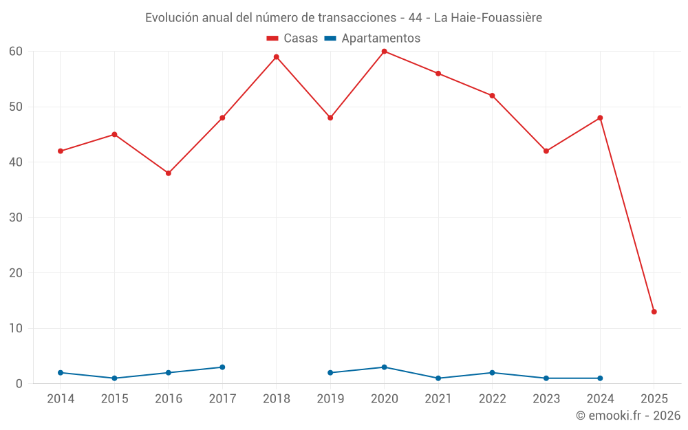 El precio mediano en las 42 transacciones de casas de los últimos 12 meses en la comuna de La Haie-Fouassière fue de 2 656 € por metro cuadrado para un valor patrimonial medio de 275 000 €. Durante este período el 60% de las transacciones estuvieron entre 2 001 y 3 233 € por metro cuadrado (del 2º al 8º decil).