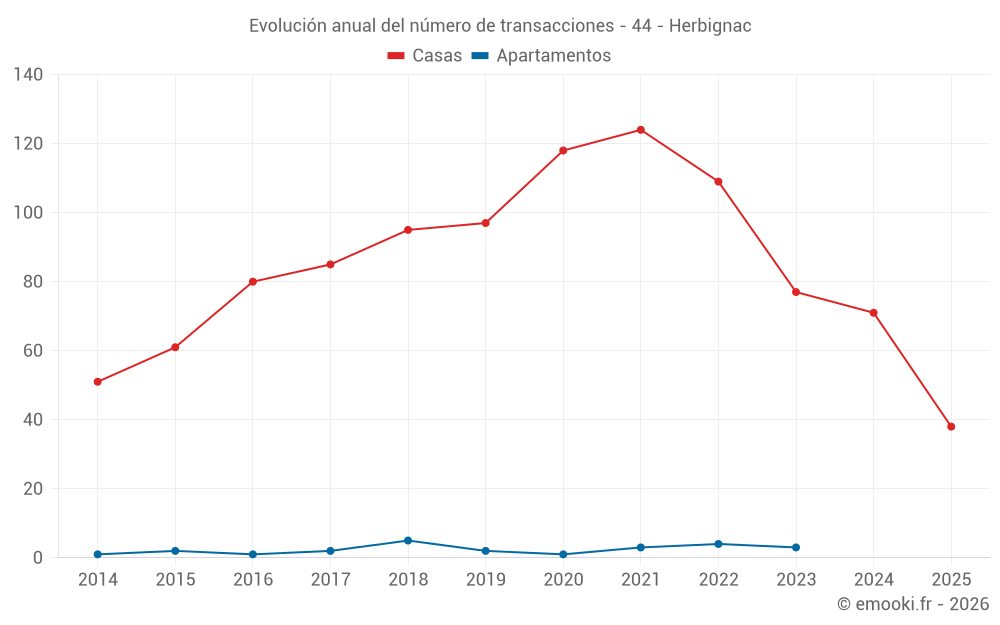 El precio mediano en las 38 transacciones de casas de los últimos 6 meses en la comuna de Herbignac fue de 2 781 € por metro cuadrado para un valor patrimonial medio de 271 500 €. Durante este período el 60% de las transacciones estuvieron entre 2 128 y 3 119 € por metro cuadrado (del 2º al 8º decil).