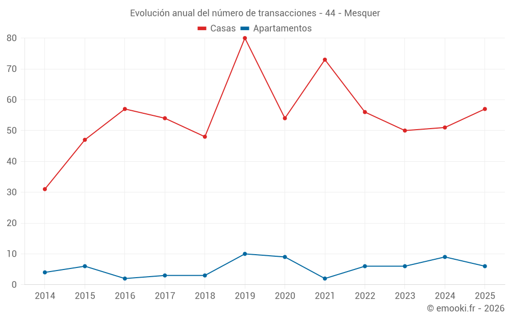 El precio mediano en las 32 transacciones de casas de los últimos 6 meses en la comuna de Mesquer fue de 3 993 € por metro cuadrado para un valor patrimonial medio de 384 500 €. Durante este período el 60% de las transacciones estuvieron entre 2 695 y 5 128 € por metro cuadrado (del 2º al 8º decil).
