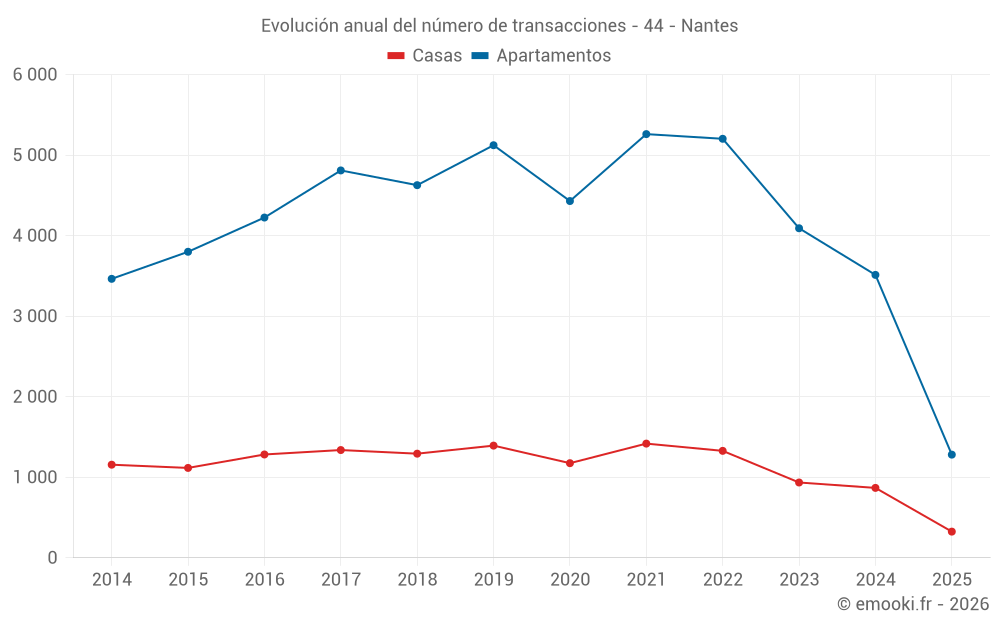 El precio mediano en las 93 transacciones de casas de los últimos 3 meses en la comuna de Nantes fue de 3 833 € por metro cuadrado para un valor patrimonial medio de 424 955 €. Durante este período el 60% de las transacciones estuvieron entre 3 042 y 5 398 € por metro cuadrado (del 2º al 8º decil).