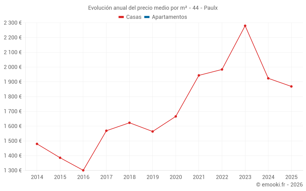 El precio mediano en las 28 transacciones de casas de los últimos 24 meses en la comuna de Paulx fue de 1 990 € por metro cuadrado para un valor patrimonial medio de 166 750 €. Durante este período el 60% de las transacciones estuvieron entre 1 548 y 2 516 € por metro cuadrado (del 2º al 8º decil).