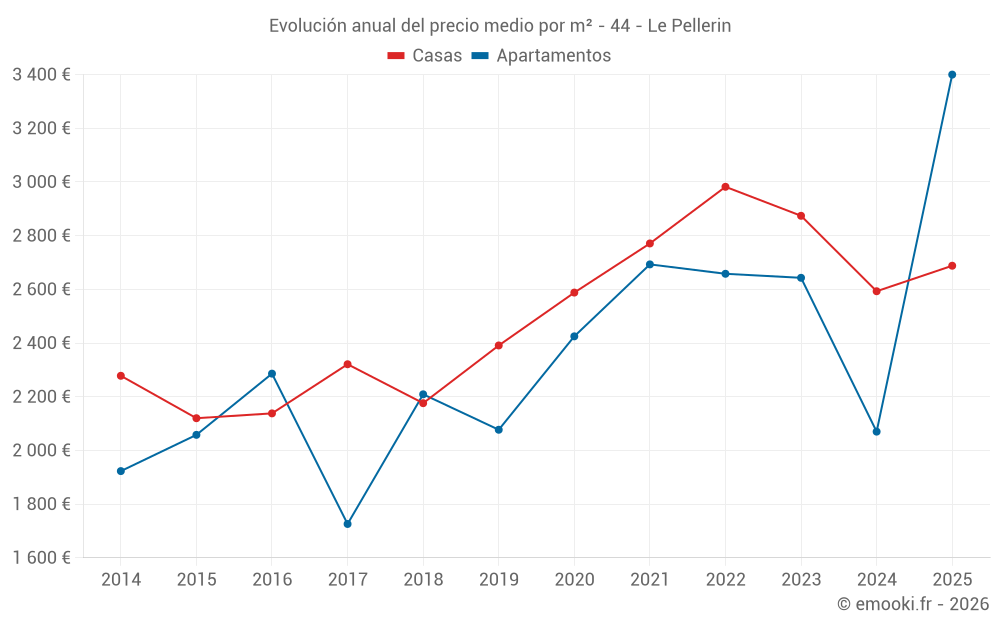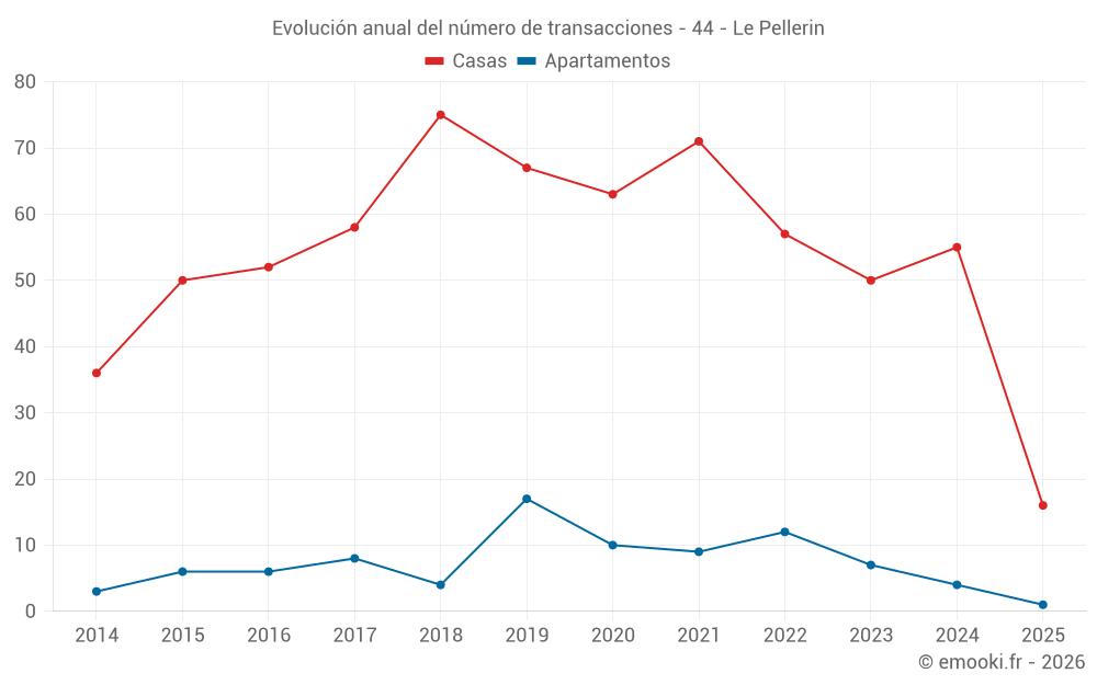 El precio mediano en las 46 transacciones de casas de los últimos 12 meses en la comuna de Le Pellerin fue de 2 653 € por metro cuadrado para un valor patrimonial medio de 242 500 €. Durante este período el 60% de las transacciones estuvieron entre 1 857 y 3 065 € por metro cuadrado (del 2º al 8º decil).