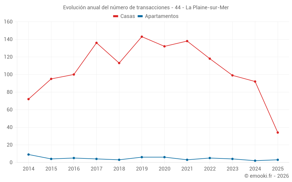 El precio mediano en las 34 transacciones de casas de los últimos 6 meses en la comuna de La Plaine-sur-Mer fue de 4 052 € por metro cuadrado para un valor patrimonial medio de 275 000 €. Durante este período el 60% de las transacciones estuvieron entre 3 537 y 4 595 € por metro cuadrado (del 2º al 8º decil).