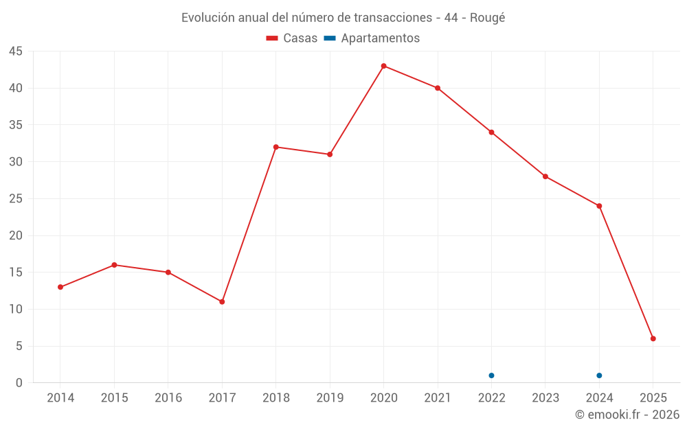 El precio mediano en las 20 transacciones de casas de los últimos 12 meses en la comuna de Rougé fue de 1 087 € por metro cuadrado para un valor patrimonial medio de 131 000 €. Durante este período el 60% de las transacciones estuvieron entre 694 y 1 839 € por metro cuadrado (del 2º al 8º decil).