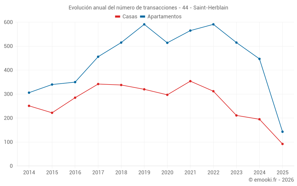 El precio mediano en las 35 transacciones de apartamentos de los últimos 3 meses en la comuna de Saint-Herblain fue de 2 530 € por metro cuadrado para un valor patrimonial medio de 150 000 €. Durante este período el 60% de las transacciones estuvieron entre 1 744 y 3 347 € por metro cuadrado (del 2º al 8º decil).
