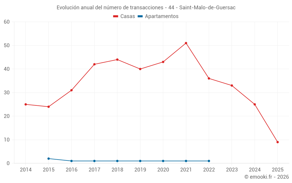 El precio mediano en las 25 transacciones de casas de los últimos 12 meses en la comuna de Saint-Malo-de-Guersac fue de 2 198 € por metro cuadrado para un valor patrimonial medio de 215 000 €. Durante este período el 60% de las transacciones estuvieron entre 1 597 y 2 562 € por metro cuadrado (del 2º al 8º decil).