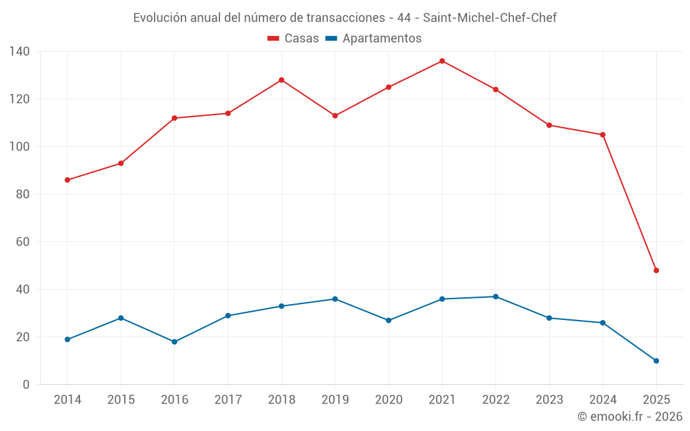 El precio mediano en las 25 transacciones de apartamentos de los últimos 12 meses en la comuna de Saint-Michel-Chef-Chef fue de 4 259 € por metro cuadrado para un valor patrimonial medio de 121 500 €. Durante este período el 60% de las transacciones estuvieron entre 2 968 y 5 413 € por metro cuadrado (del 2º al 8º decil).